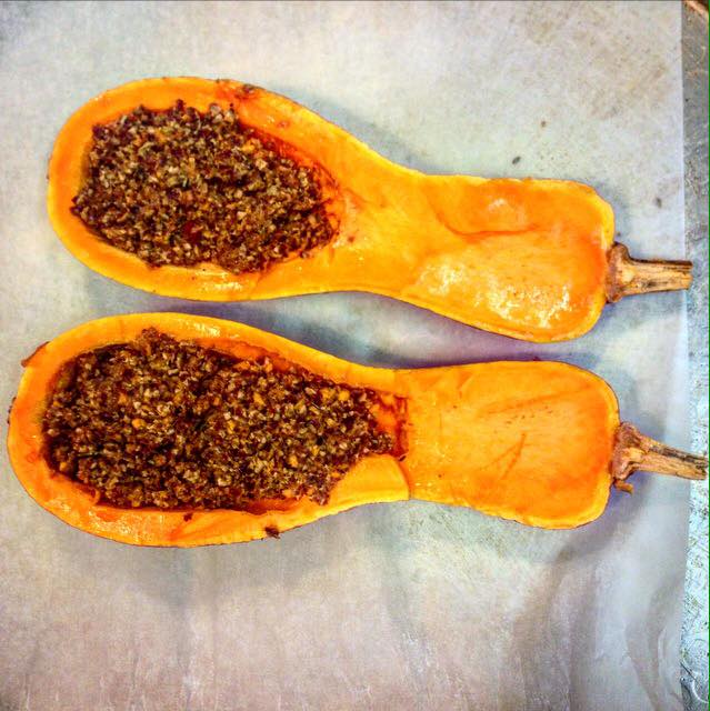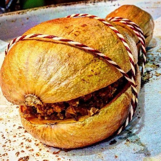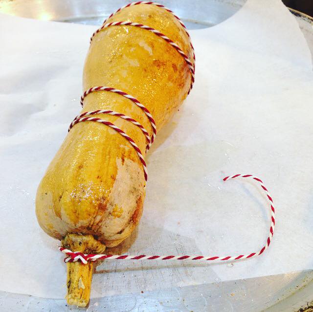Cuoci in forno chiudendo le due metà con spago come se legassi un tacchino, facendole aderire bene a “chiudere” la zucca di nuovo intera.